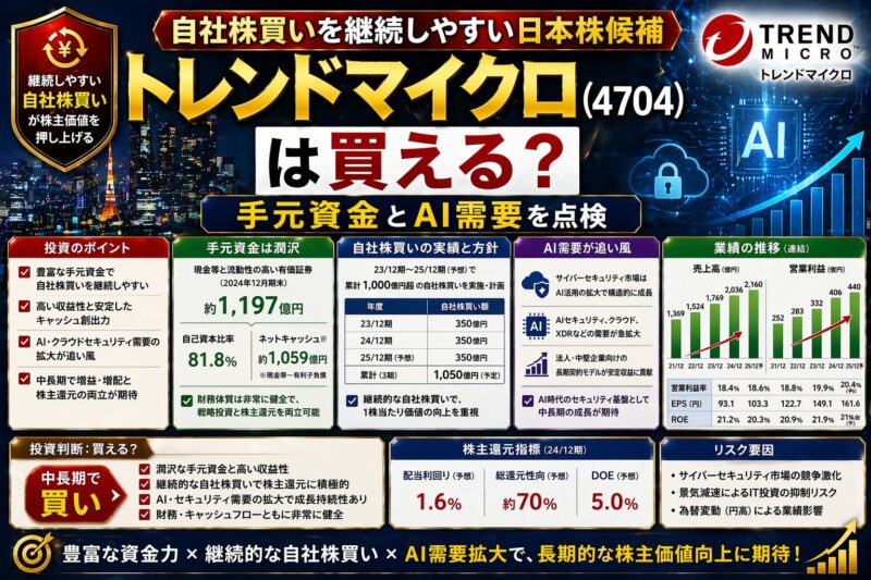 自社株買いを継続しやすい日本株候補、トレンドマイクロ(4704)は買える?手元資金とAI需要を点検