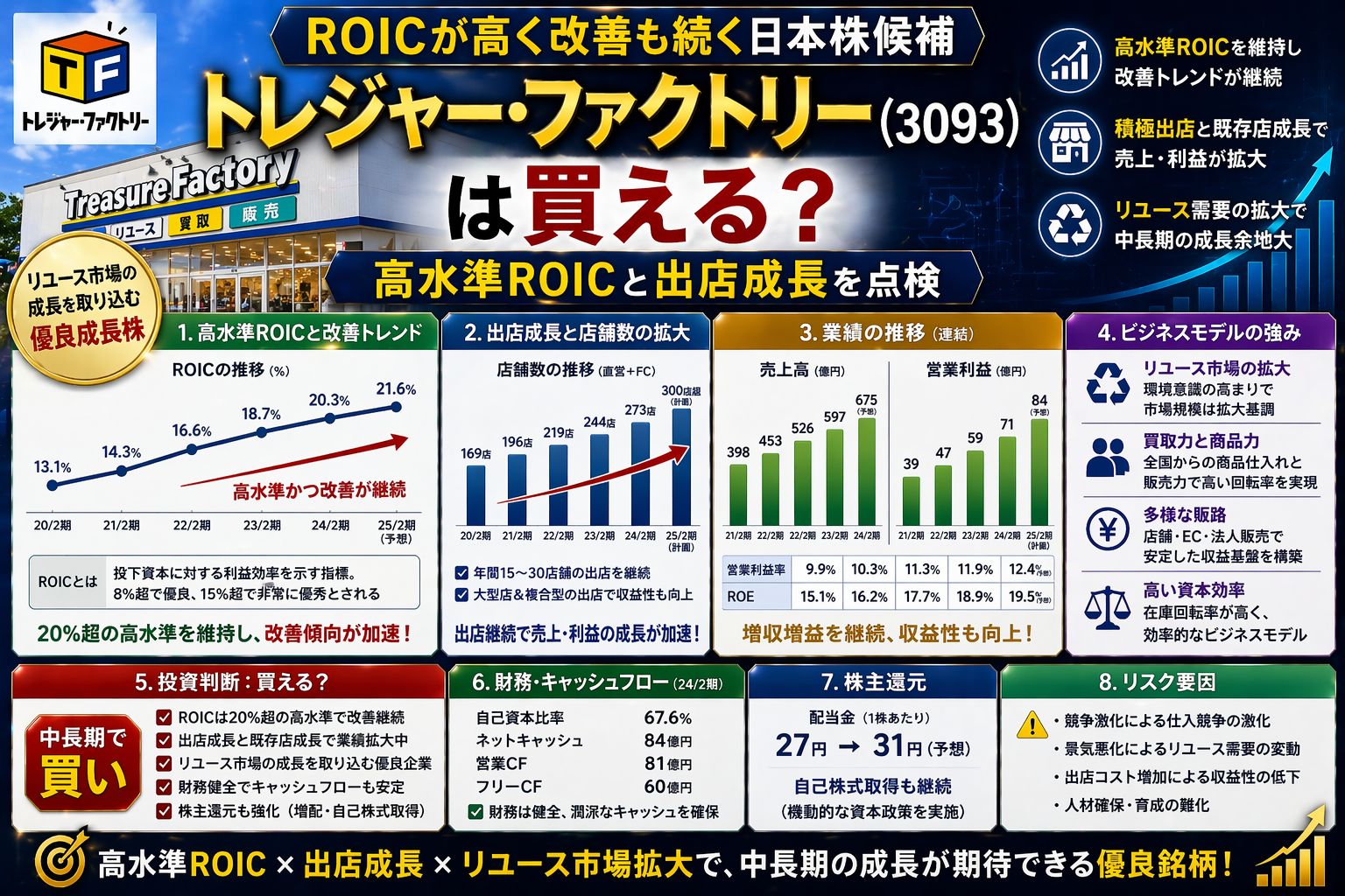 ROICが高く改善も続く日本株候補、トレジャー・ファクトリー(3093)は買える?高水準ROICと出店成長を点検